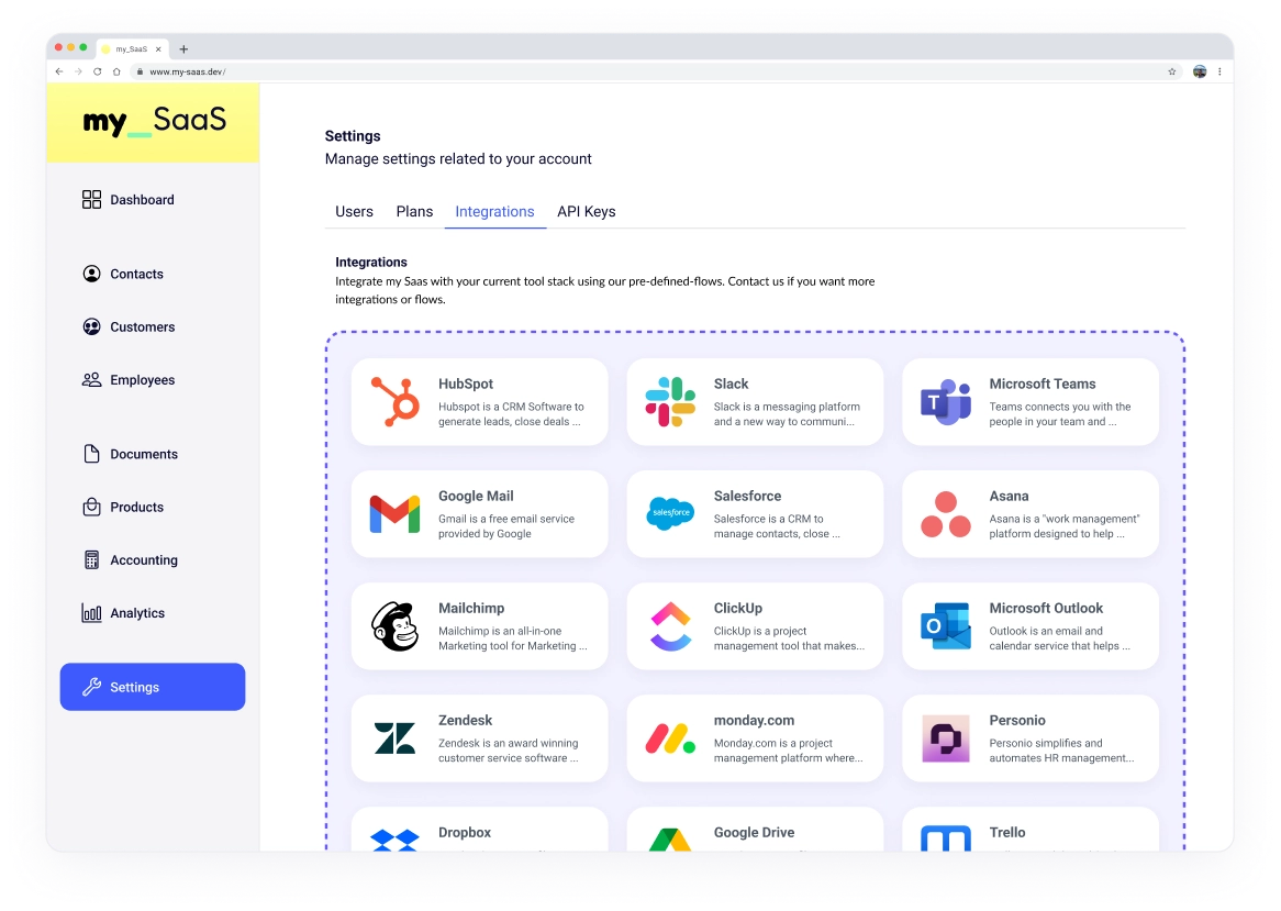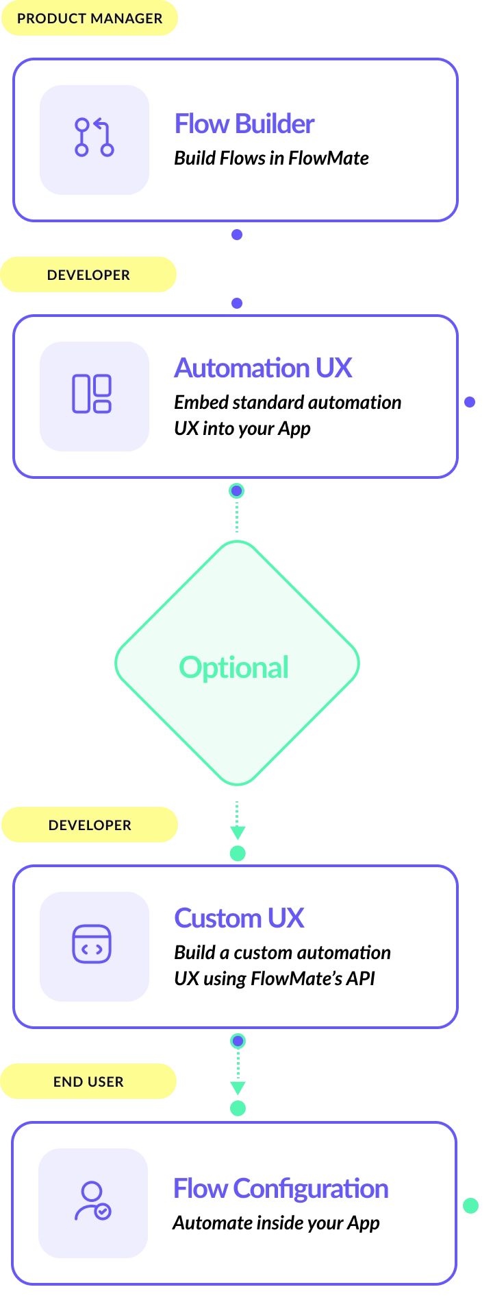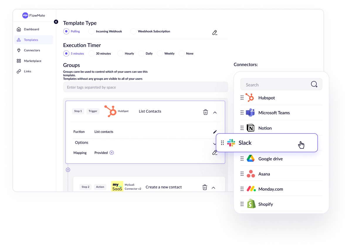 Embed a ready-to-use Automation UX that brings your Flow Templates to life. FlowMate generates a complete, branded integration experience automatically, including authentication, configuration, and self-service setup for every user.