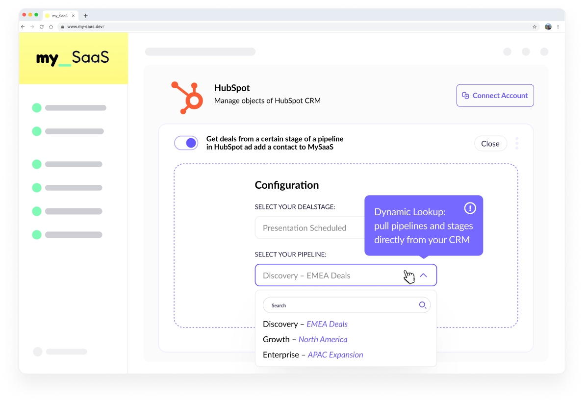 Add automation to your app with authentication, intuitive configuration, and instant activation in an auto-generated UX that empowers every user to set up flows effortlessly without technical skills or external tools.