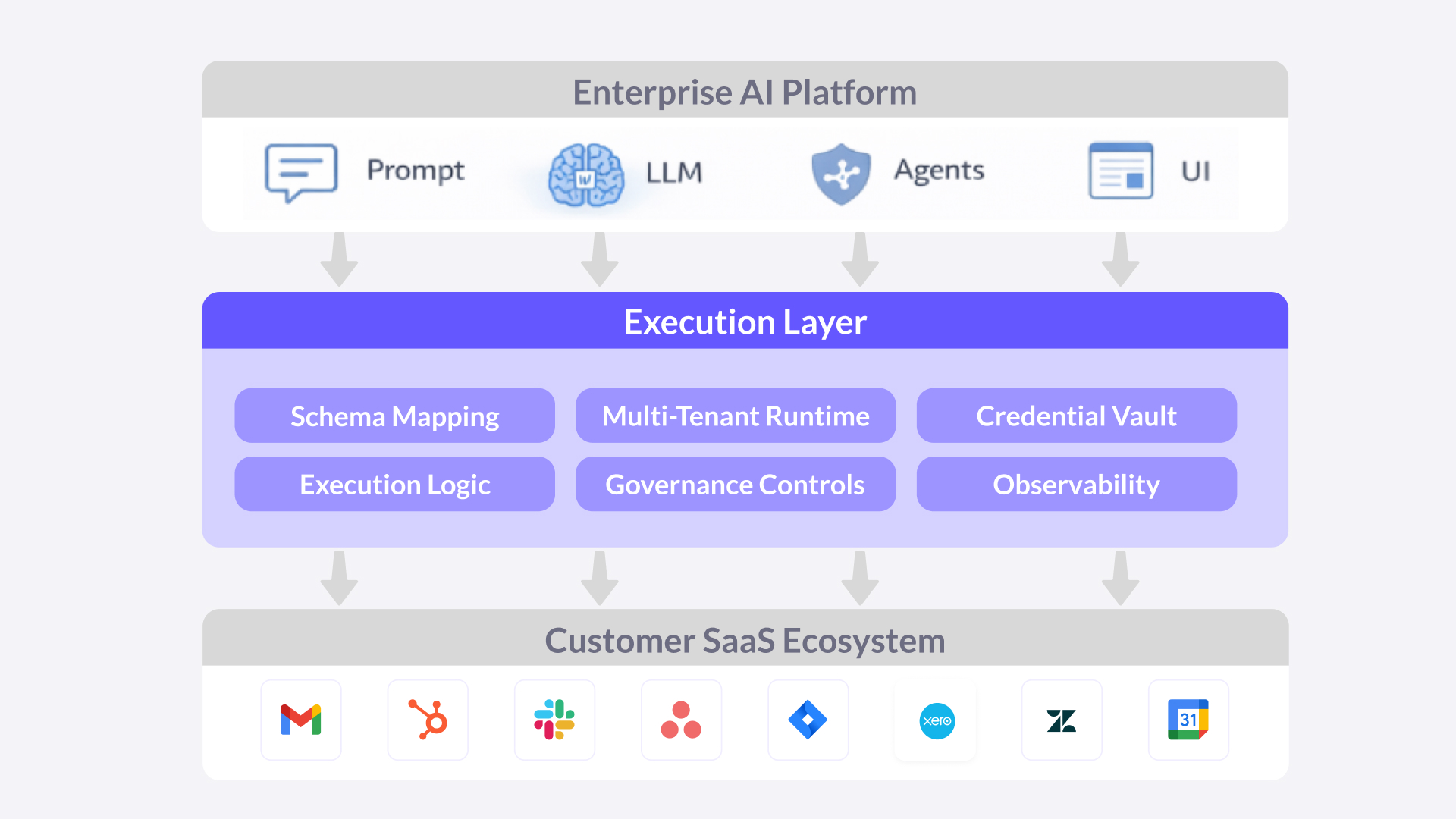 It requires a universal capability to execute across public APIs, tenant-isolated runtime contexts, persistent credential management, and strict governance over how actions are triggered and controlled.