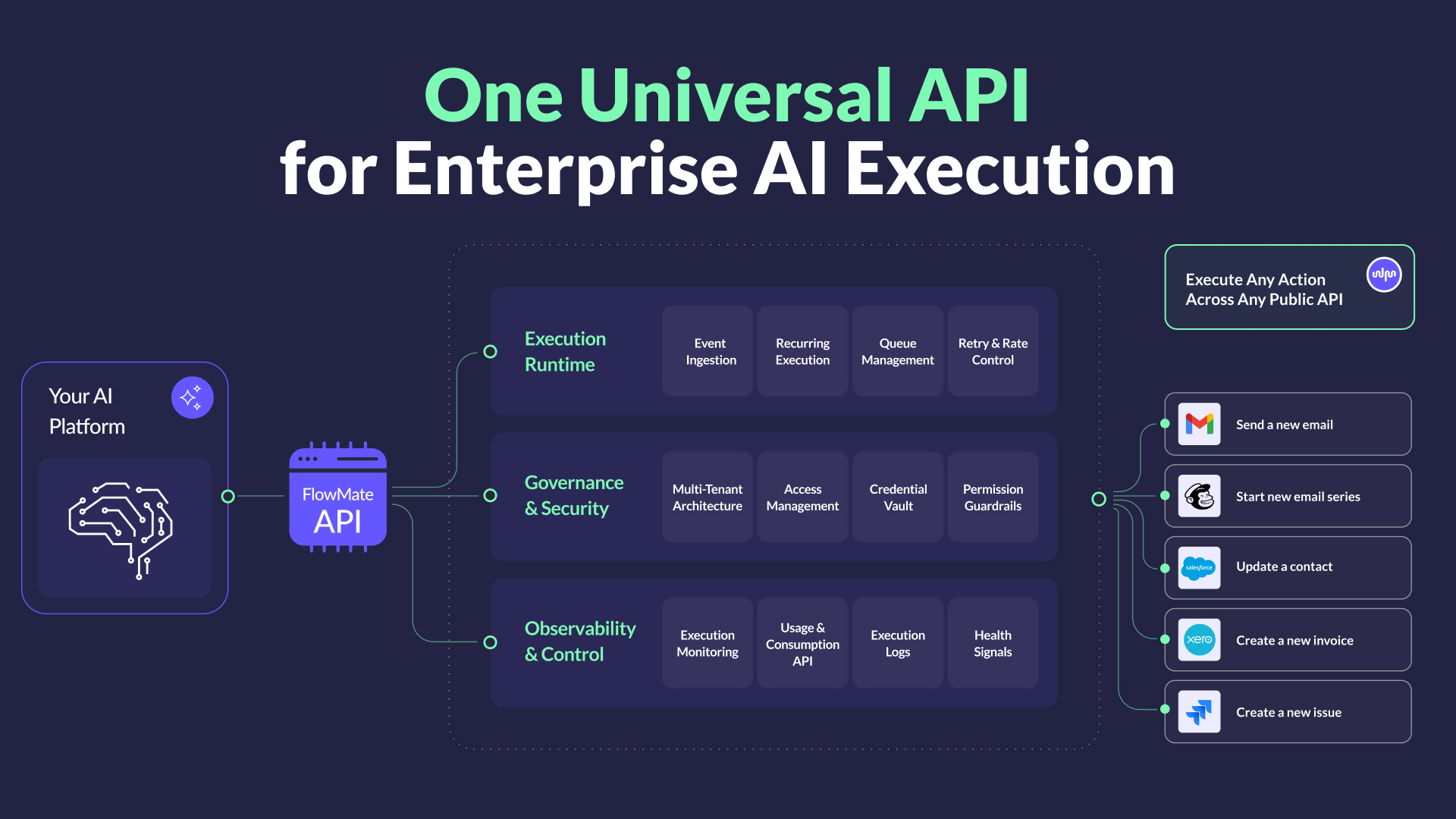 Instead of building and maintaining execution infrastructure in-house, AI platforms integrate a universal execution layer via one universal API. FlowMate handles authentication, tenant isolation, rate control, retry logic, observability, and universal endpoint coverage, while your product retains full control over user experience and agent behavior.Â