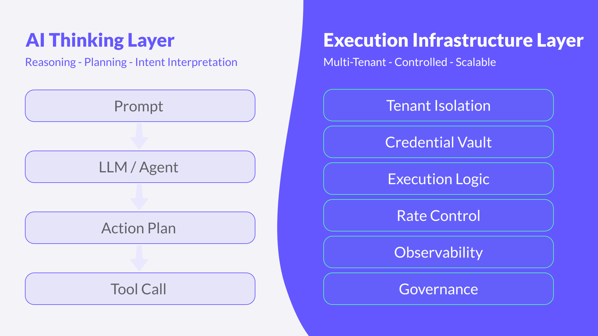 But MCP enables connection. It does not provide governed, repeatable, multi-tenant execution infrastructure. Enterprise workflows require persistent credential management, tenant isolation, rate control, retry handling, observability, and controlled execution across environments.
