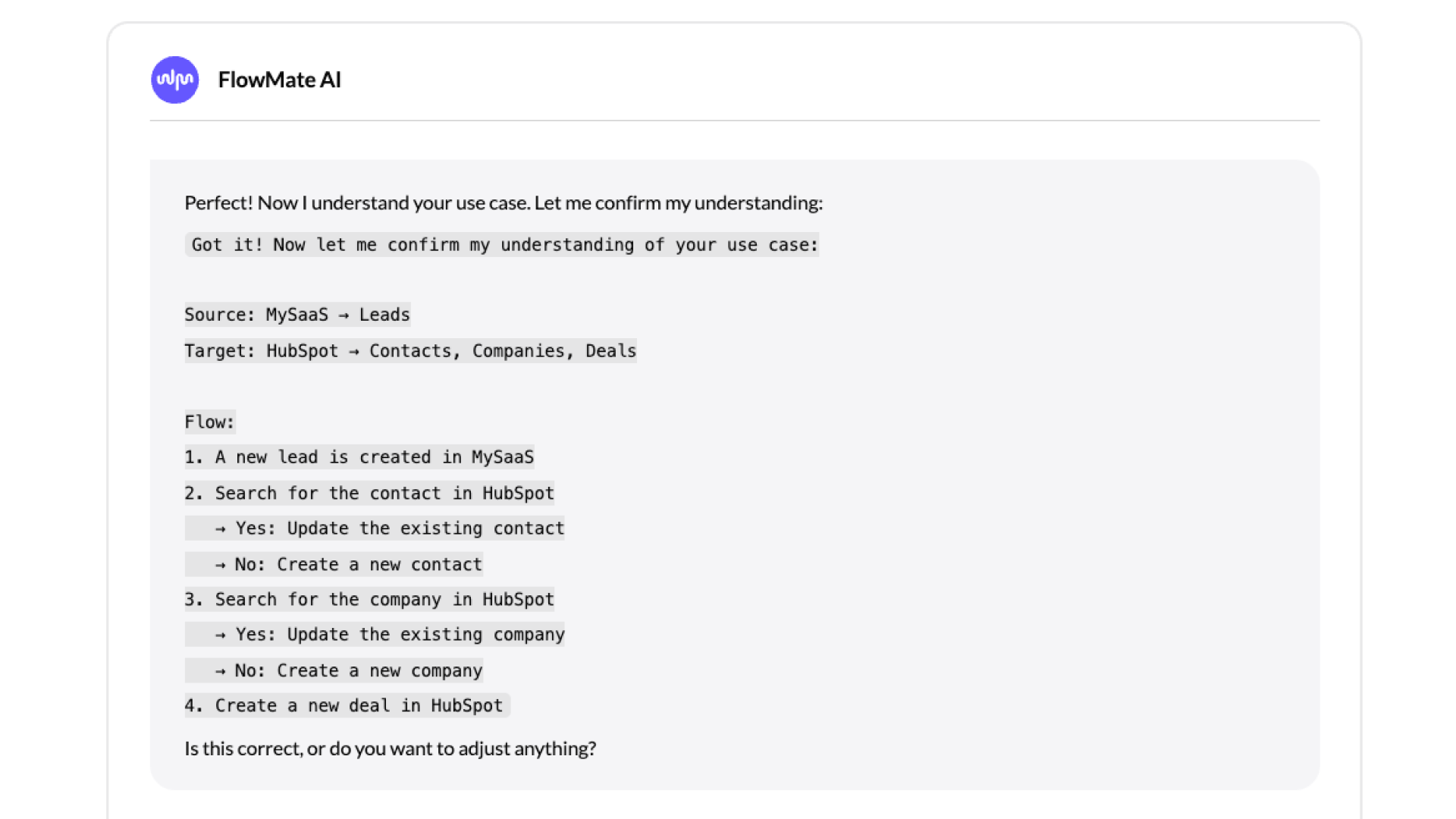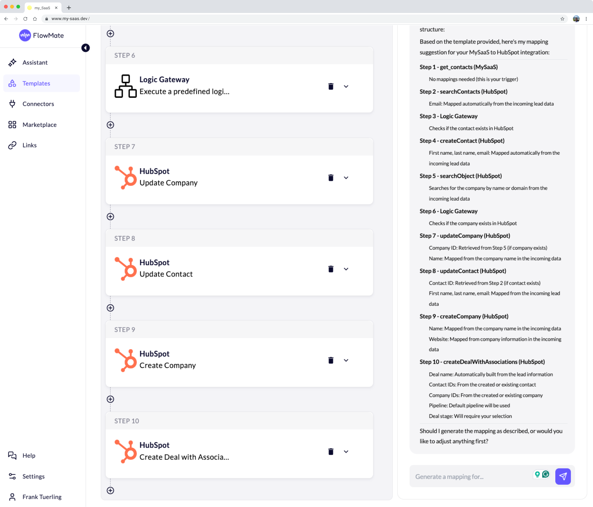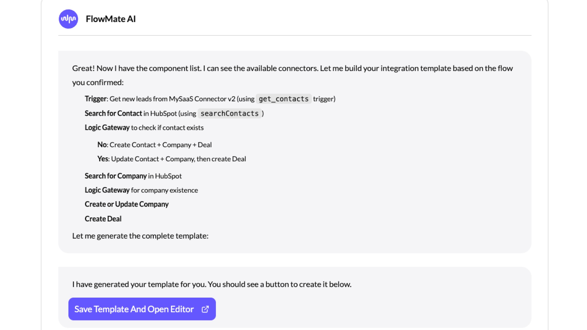 From that single confirmation, FlowMate AI generated a complete 10-step integration template, including trigger detection, conditional logic for both contact and company, separate create and update paths, and a final deal creation step with full associations.