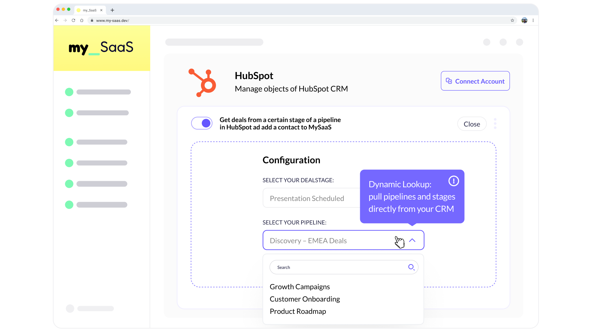 The end result is what the customer sees inside the product: a native configuration screen with live data pulled directly from their HubSpot account. No static dropdowns. No hardcoded values. Their actual pipelines and stages, surfaced at runtime.