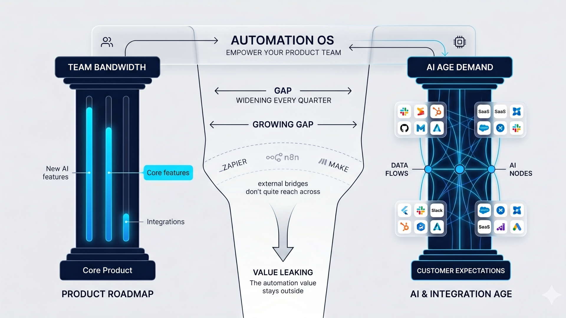 Product leaders understand the value. But with limited resources and a backlog full of competing priorities, integrations keep losing the fight for the next sprint. They get acknowledged, added to the roadmap, and pushed every quarter. To soften the gap, customers get pointed toward external platforms like Zapier, n8n, or Make. The automation value stays outside the product. SaaS companies keep the customer relationship, but they do not own, manage, or control how their customers automate.