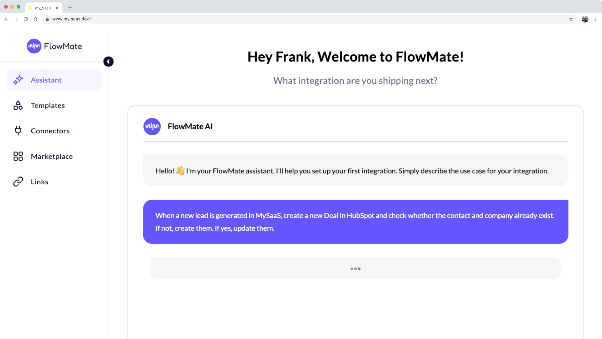 “When a new lead is generated in MySaaS, create a new Deal in HubSpot and check whether the contact and company already exist. If not, create them. If yes, update them.”