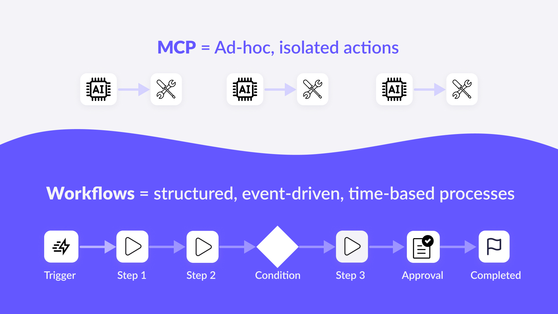 Workflows also depend on structure. They consist of multiple steps, dependencies, conditions, approvals, and transformations. MCP does not contain these concepts. It knows how to call an API, but not how to orchestrate a sequence of actions or handle what happens in between.