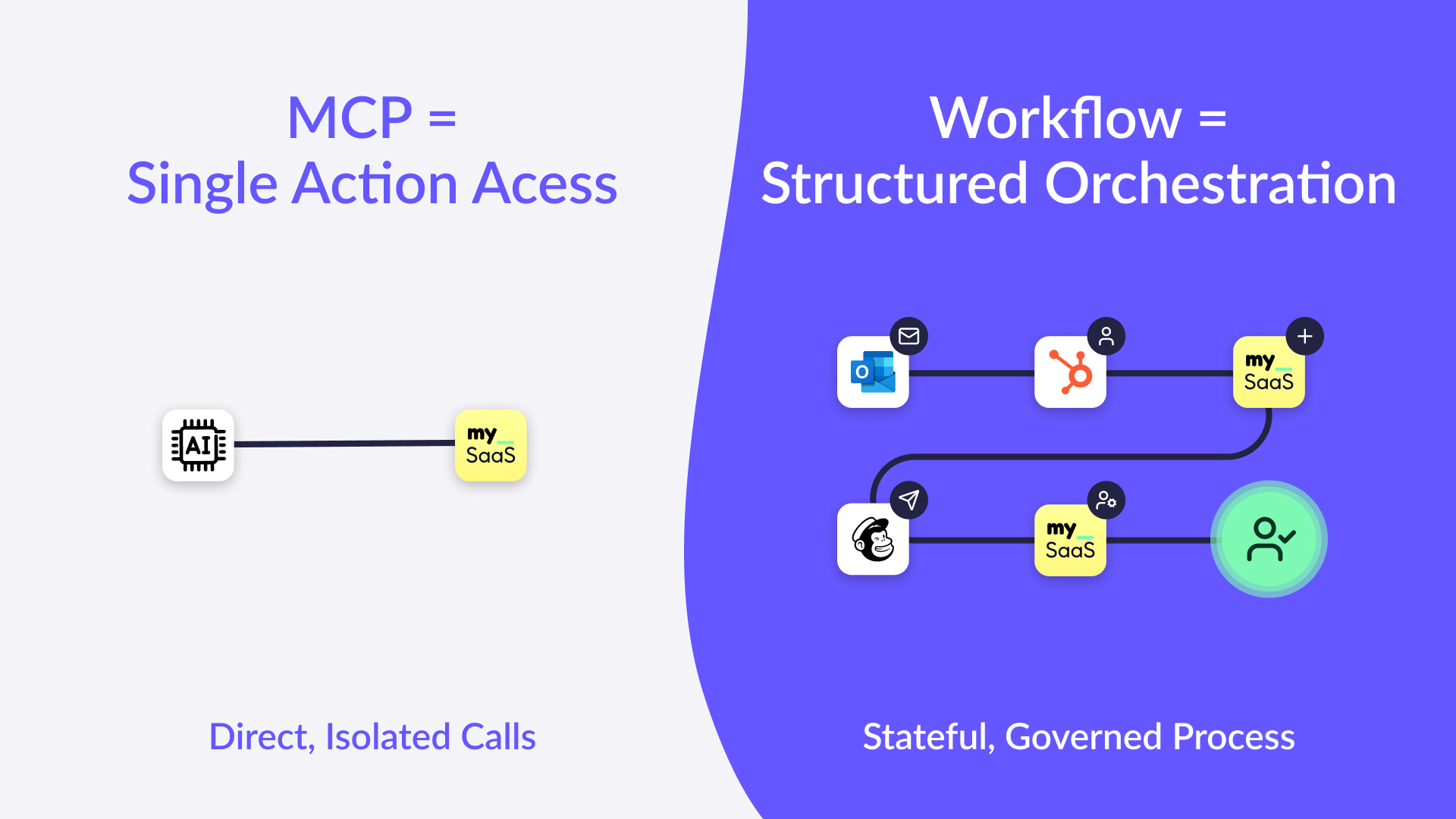Finally, workflows demand governance – permissions, auditability, compliance, and predictable behavior. MCP executes actions, but it cannot control who is allowed to run them or under what circumstances.