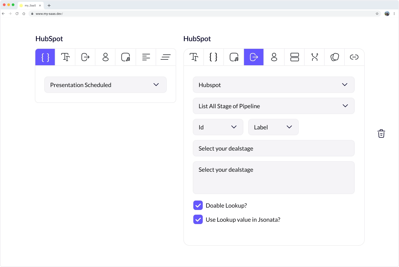 Every flow you pre-build in FlowMate automatically generates a branded configuration experience inside your app. The field mappings, logic, and data connections you define in the Flow Builder transform into a ready-to-use embedded UX. End users can activate, adjust, and manage workflows on their own instantly and intuitively.