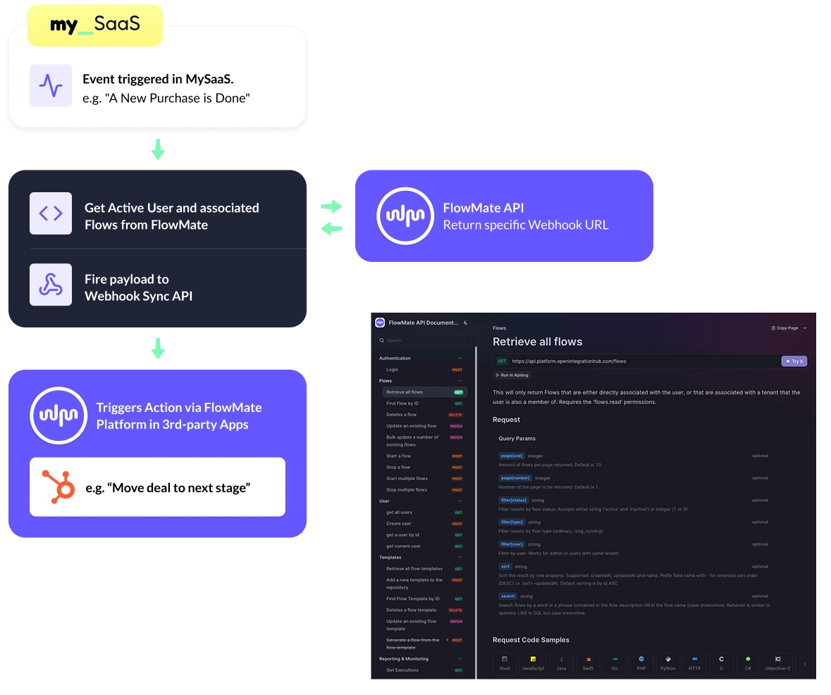 Integrate your workflow builder with a single API that exposes triggers, actions, context, and execution. Control every workflow through clean, predictable endpoints without maintaining infrastructure or building custom orchestration logic.