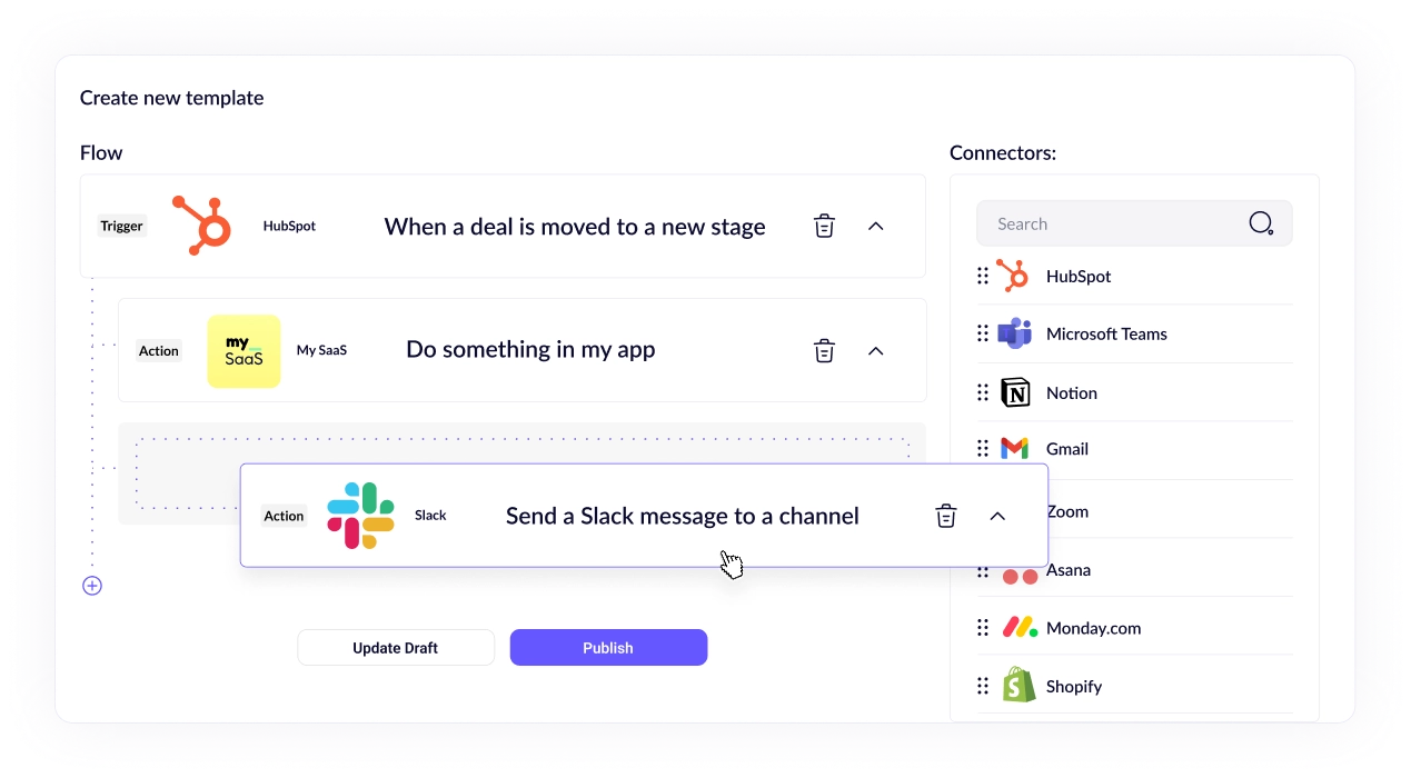 Your customers’ workflows are cross-app by default. Without integration, your workflow builder becomes a dead end in your customers’ automation process, and the value you provide stays limited.